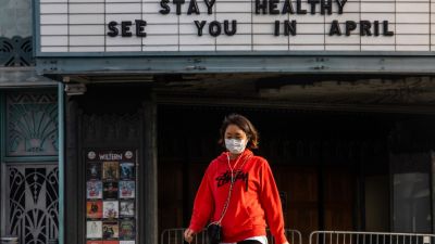 A woman walks wearing a mask to protect herself from the novel coronavirus (COVID-19) in front of a closed theater in Koreatown, Los Angeles, on March 21, 2020. All 40 million residents of California were on March 19 ordered to stay at home indefinitely in a bid to battle the coronavirus pandemic in the nation's most populous state. Apu GOMES / AFP