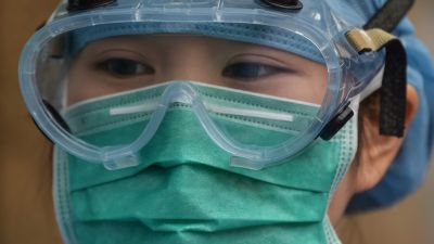 A medical worker wearing protective clothing as a preventive measure against the COVID-19 coronavirus, stands at Xuhui District Hospital in Shanghai on March 9, 2020 China reported 22 new deaths on March 9 from the new coronavirus epidemic, and the lowest number of fresh cases since it started reporting the data in January. Hector RETAMAL / AFP