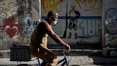A man wears a face mask as he rides a bicycle in Havana, on May 25, 2020. Cuba reported 1947 confirmed cases of COVID-19 and 82 deceased due to the virus. YAMIL LAGE / AFP