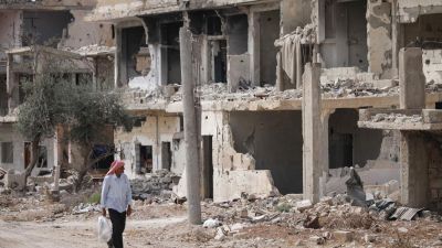 A man walks past destroyed buildings in an opposition-held neighbourhood of the southern city of Daraa, on 2 October 2018 (AFP)