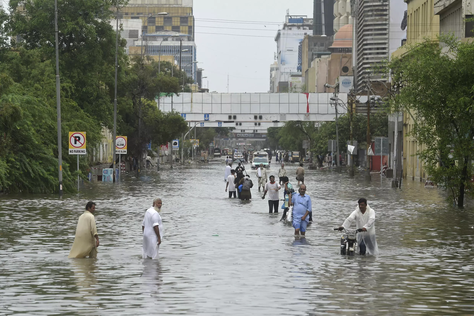 People wade across a flooded street in Karachi Asif Hassan AFP