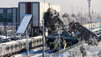 After the crash a pedestrian overpass also collapsed onto some of the train cars, according to the Ankara governor’s office.