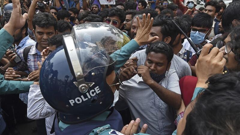 Activists from the left parties scuffle with the police during a demonstration in Dhaka on March 1, 2021, following the death of writer Mushtaq Ahmed in jail months after his arrest. Munir UZ ZAMAN / AFP