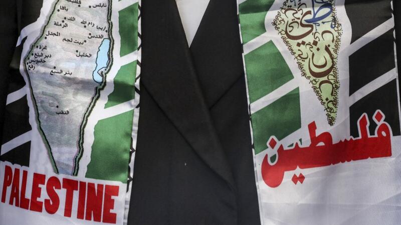 A member of the Neturei Karta movement, a small faction of anti-Zionist ultra-Orthodox Jews who oppose Israel's existence, wearing a scarf showing a map of historic Palestine with its Arabic city names and text in English and Arabic reading "Palestine", attends a demonstration in support of Palestinians held in Israeli prisons and hunger-striking detainee Maher al-Akhras in the centre of the flashpoint West Bank city of Hebron on October 21, 2020. The Palestinian on hunger strike for over 80 days since his arrest by Israel in late July is "on the verge of death", according to Israeli rights group B'Tselem. Maher al-Akhras, 49, was arrested near Nablus and placed in administrative detention, a policy that Israel uses to hold suspected militants without charge. HAZEM BADER / AFP