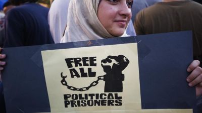 A woman holds up a sign at a demonstration in Cairo demanding freedom for all political prisoners in July 2012. (AFP/Gianluigi Guerci)