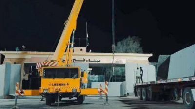 Saleh Aljafarawi shared two photos one showing the sign "Rafah border crossing" with workers on a huge equipment truck while placing the huge cement wall.