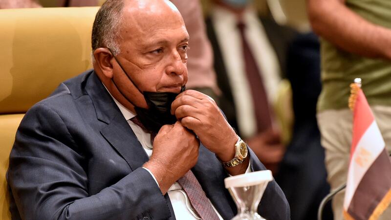 Egypt's Foreign Minister Sameh Shoukry attends a meeting by Libya's neighbours as part of international efforts to reach a political settlement to the country's conflict, in the Algerian capital Algiers, on August 30, 2021. (Photo by RYAD KRAMDI / AFP)