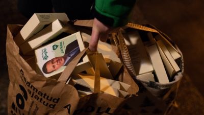 Estonias's Prime Minister Juri Ratas of the centrist Centre party holds a bag full of campaign material as he campaigns (AFP)