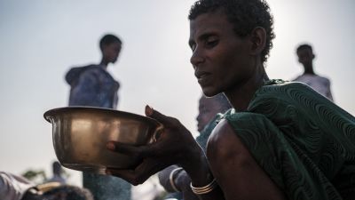 An Internally Displaced Person (IDP), fleeing from violence in the Metekel zone in Western Ethiopia, holds a bowl with food at a camp in Chagni, Ethiopia, on January 27, 2021. Inter-ethnic violence in Ethiopia's west -- concentrated in a lowland area known as Metekel -- predates a brutal three-month-old conflict farther north pitting Prime Minister Abiy Ahmed's government against the former ruling party of the Tigray region.  EDUARDO SOTERAS / AFP