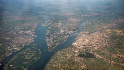 This picture taken on October 15, 2021 shows an aerial view of the southernmost tip of Egypt's Nile delta region, including the Qanater al-Khayreya Nile river barrages, north of the capital Cairo. (Photo by Amir MAKAR / AFP)