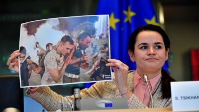 Belarus opposition leader Svetlana Tikhanovskaya holds up a photograph as she addresses members of the EU parliament at the EU headquarters in Brussels on September 21, 2020. European foreign ministers welcomed Belarus opposition leader Svetlana Tikhanovskaya to Brussels as they prepare EU sanctions to support her battle against the Minsk regime. The former Soviet republic has been convulsed by unprecedented demonstrations against President Alexander Lukashenko since he was returned to power in a disputed August 9 election -- and those protests have been brutally repressed. JOHN THYS / AFP
