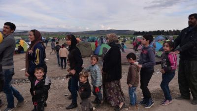 Syrian and Iraqi refugees wait to receive food at the Greek-Macedonian border near the village of Idomeni on February 27 , 2016. (AFP/Louisa Gouliamaki)