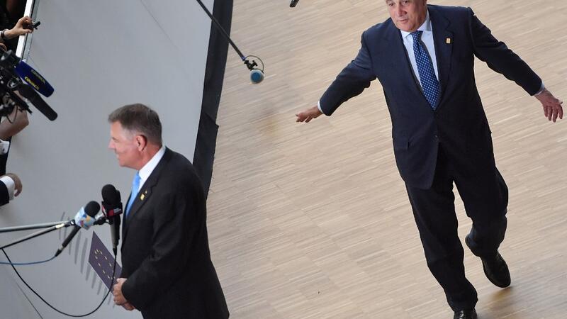 European Parliament President Antonio Tajani arrives as Romania's President Klaus Werner Iohannis (L) speaks to the press prior to an European Council Summit at The Europa Building in Brussels (AFP)