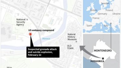 At 12.30 a.m. local time (2230GMT Wednesday), an unknown person "threw an explosive device from the intersection near the Sport Center into the U.S. Embassy compound,” probably a grenade, said a tweet by Montenegro’s government.