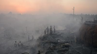 Videos were shared online showing fire and thick black smoke rising into the sky and burning the shelters of tens of thousands of people who fled the military crackdown in Myanmar.