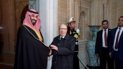 Tunisian President Beji Caid Essebsi (C) shakes hands with Saudi Arabia's Crown Prince Mohammed bin Salman (L) upon the latter's arrival at the presidential palace in the capital Tunis on November 27, 2018. (Fethi Belaid / AFP)