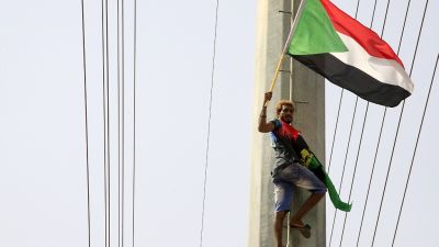 A Sudanese demonstrater waves his national flag in front of the Algerian embassy as people celebrate in Khartoum (AFP)