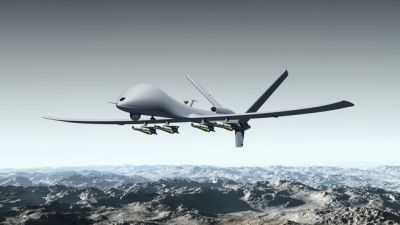 Illustration of a combat drone flying over barren mountains (Shutterstock/Paul Fleet)