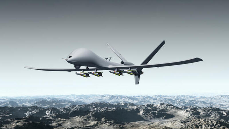 Illustration of a combat drone flying over barren mountains Illustration of a combat drone flying over barren mountains Illustration of a combat drone flying over barren mountains (Shutterstock/Paul Fleet)