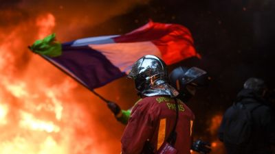 A French fire fighter walks towards flames as a Yellow vests (Gilets jaunes) demonstrator waves the French flag during protests against rising oil prices and living costs in the French capital Paris on December 1, 2018. (AFP)