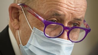 French Minister of Europe and Foreign Affairs Jean-Yves Le Drian, wearing a face mask, attends a meeting with his Slovenian counterpart in Ljubljana on September 3, 2020. Jure Makovec / AFP