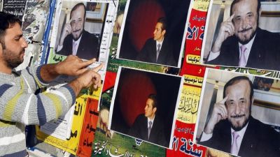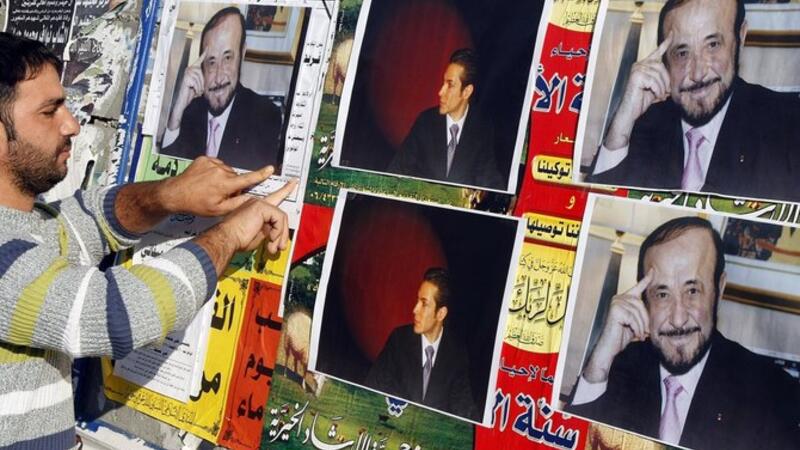 Above, pictures Rifaat Assad, right, the uncle of the Syrian president Bashar Assad, and Rifaat’s son Ribal are posted on a wall in Tripoli in this photo taken on December 6, 2007. (AFP)