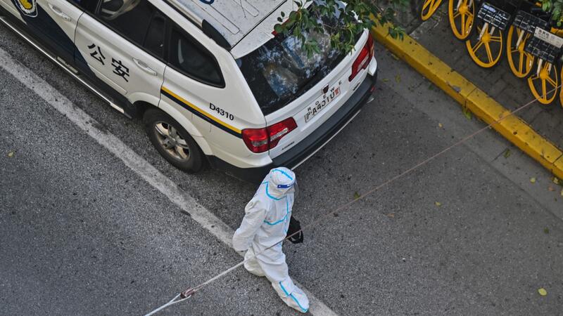 A policeman wearing personal protective equipment (PPE) walks on a street during a COVID-19 lockdown in the Jing'an district in Shanghai on April 8, 2022. (Photo by Hector RETAMAL / AFP)