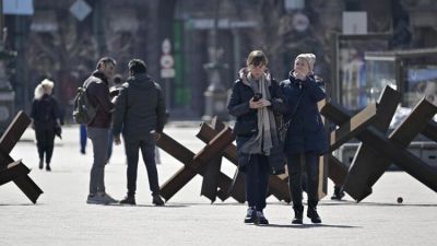 Pedestrians walk past anti-tank obstacles in downtown Kyiv on April 15, 2022. Russian strikes pounded a military factory near Kyiv that makes the missiles Ukraine claims it used to sink the Moskva naval flagship, with Moscow on Friday vowing renewed attacks on the capital. (Photo by Genya SAVILOV / AFP)