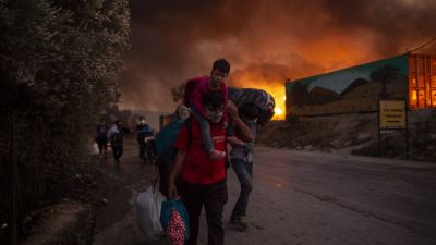 People with children flee flames after a major fire broke out in the Moria migrants camp on the Greek Aegean island of Lesbos, on September 9, 2020. ANGELOS TZORTZINIS / AFP