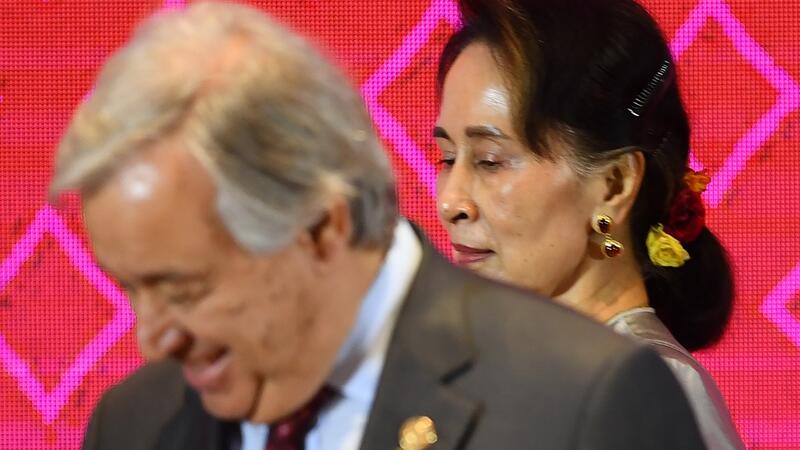 Myanmar’s defacto leader, Suu Kyi, listened on as Guterres spoke.