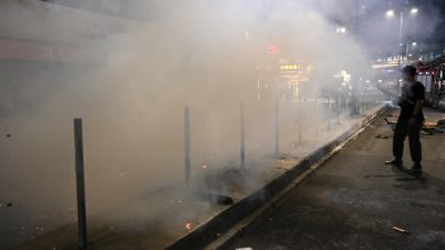The latest violence came after thousands of people flooded Tamar Park in Hong Kong on Saturday night for a peaceful vigil to mourn the death of a university student who fell from a parking lot floor in unexplained circumstances during a police dispersal operation.