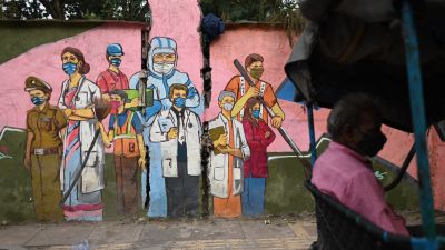 A rickshaw driver waits for customers in front of a mural depicting Covid-19 coronavirus frontline workers in New Delhi on November 6, 2021. (Photo by Sajjad HUSSAIN / AFP)