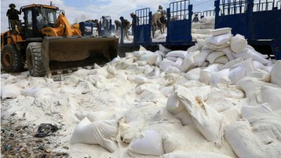 The Houthis used diggers to break up sacks of maggot-ridden rice and flour. (AFP/ File Photo)