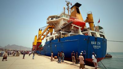 A UN aid ship docked in Yemen's devastated port city of Aden last July (World Food Programme/AFP)