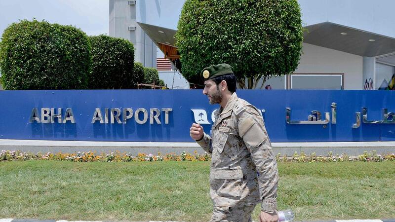A Saudi serviceman walks by a sign outside Abha airport. (AFP)
