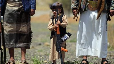 A Yemeni boy holds a rifle as fighters loyal to the Iran-backed Huthi rebels rally to express solidarity with the Palestinians, in the capital Sanaa, on May 20, 2021. Israel and the Palestinians are mired in their worst conflict in years as Israel pounds the Gaza Strip with air strikes and artillery, while Hamas militants fire rockets into the Jewish state. MOHAMMED HUWAIS / AFP