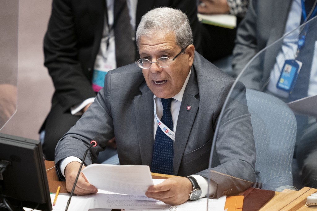Othman Jerandi, minister of foreign affairs of Tunisia, speaks during a meeting of the United Nations Security Council during the 76th Session of the U.N. General Assembly at U.N. headquarters on September 23, 2021 in New York City. More than 100 heads of state or government are attending the session in person, although the size of delegations are smaller due to the Covid-19 pandemic. John Minchillo-Pool/Getty Images/AFP