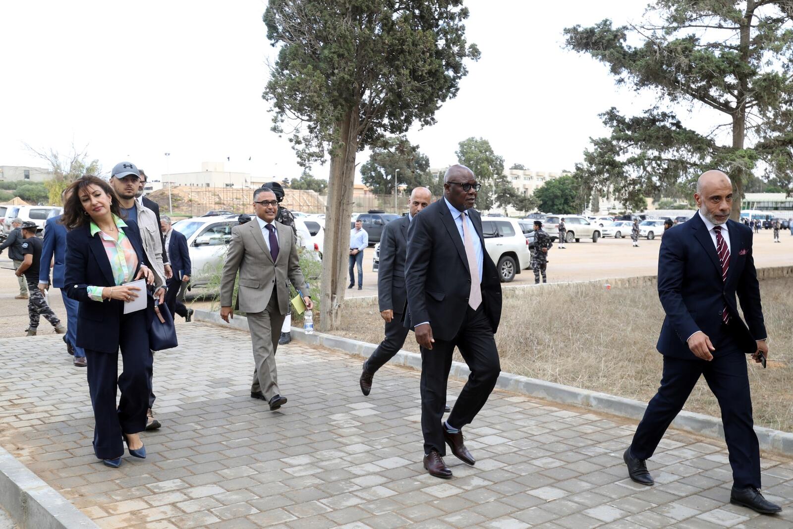 Abdoulaye Bathily (C), UN Special Representative for Libya and Head of the United Nations Support Mission in Libya (UNSMIL), arrives for an election simulation meeting in the capital Tripoli on November 5, 2022. (Photo by Mahmud Turkia / AFP)