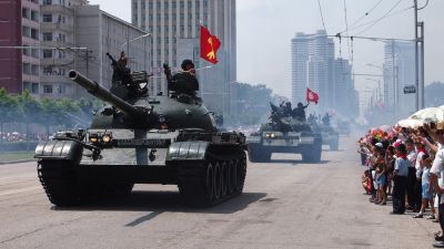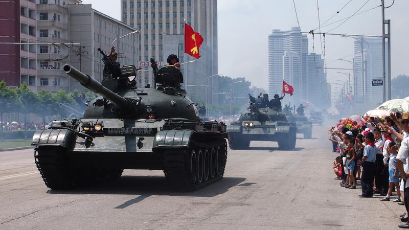 Military tanks parade in front of waving crowds through the streets of Pyongyang, North Korea. (Shutterstock/ File Photo)