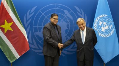 Suriname President Chandrikapersad Santokhil shakes hands with United Nations Secretary General Antonio Guterres at the UN headquarters in New York, September 18, 2022, during the 77th session of the UN General Assembly. (Photo by Craig Ruttle / POOL / AFP)