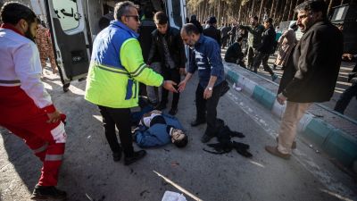 Iranian emergency services arrive at the site where two explosions in quick succession struck a crowd marking the anniversary of the 2020 killing of Guards general Qassem Soleimani. (Photo by MEHR NEWS / AFP)