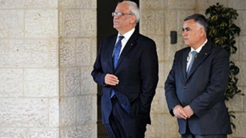Chief Palesinian negotiator Saeeb Erakat (L) and one of his deputy wait for US Secretary of State John Kerry before his meeting with Palestinian President Mahmud Abbas on July 19, 2013 at the Mukataa compound, in the West Bank city of Ramallah. Kerry flew by helicopter to the West Bank from Jordan to meet Abbas as he battled to salvage his Middle East peace bid.( FADI AROURI/AFP/Getty Images)