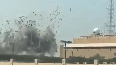 Footage of an Iranian ballistic missile slamming into the headquarters of the US Navy's 5th Fleet at Naval Support Activity (NSA) Bahrain earlier today. (Social Media)
