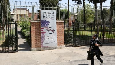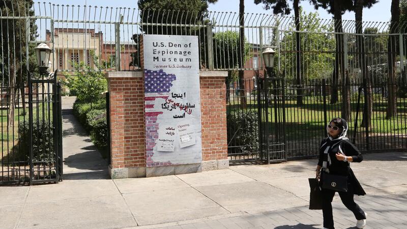 A woman walks past the US Den of Espionage Museum in the Iranian capital Tehran on June 22, 2019. Fear of a potential war and frustration over biting sanctions are high in Iran's capital, after a last-minute decision by the US to pull back from attacking the Islamic Republic. / AFP / ATTA KENARE