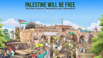 The poster, which showed a 'free' Palestine and the late Iranian general Qassem Soleimani, was published alongside the message: 'Palestine will be free. The final solution: Resistance is referendum.'