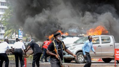 Two explosions hit Uganda's capital Kampala on November 16, 2021, injuring a number of people in what police termed an attack on the city, the latest in a string of blasts targeting the country. The explosions occurred in the central business district of Kampala near the central police station and the entrance to parliament, police said. (Photo by Ivan Kabuye / AFP)