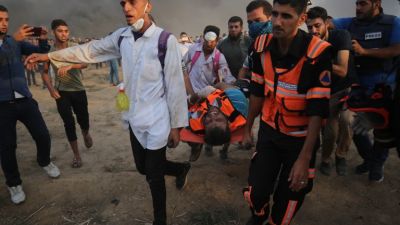 Palestinian paramedics carry a wounded protester during clashes with Israeli forces east of Gaza city, along the Gaza-Israel border in the Gaza Strip. (AFP/File)