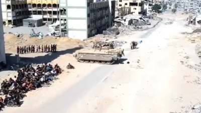 An Israeli army spokeswoman said the tape was taken 48 hours after communications were cut and air and ground attacks increased. Palestinian men of all ages stand beside tanks in the wreckage of damaged houses, with overhead shots showing groups of Palestinians approaching with their hands outstretched in surrender.