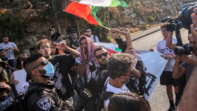Israeli police confiscate a Palestinian flag from a protester during a demonstration by Palestinian, Israeli, and foreign activists against Israeli occupation and settlement activity in the Palestinian Territories and east Jerusalem, in Jerusalem's Palestinian Sheikh Jarrah neighbourhood on July 30, 2021. (Photo by AHMAD GHARABLI / AFP)