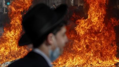 Ultra-Orthodox Jewish protesters clash with Israeli security forces during the enforcement of the coronavirus emergency regulations in Jerusalem's ultra-orthodox neighbourhood of Mea Sharim, on January 26, 2021. AHMAD GHARABLI / AFP